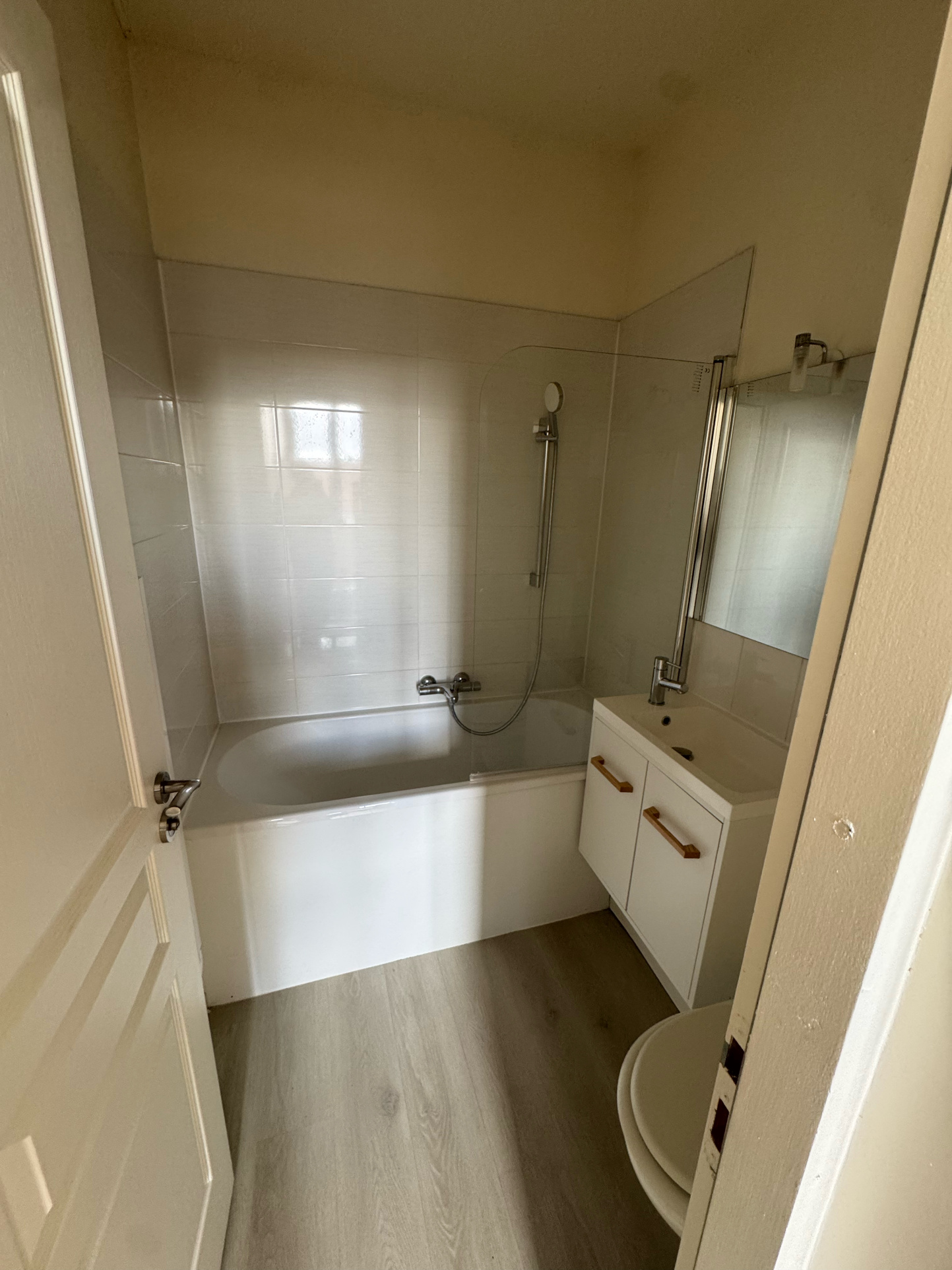 Salle d’eau équipée d’une douche, d’un meuble vasque et de WC.